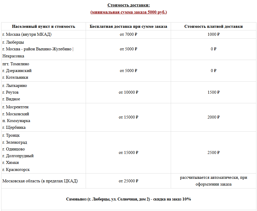 Мы осуществляем доставку заказов ежедневно (доставка бесплатная в пределах зоны доставки и в зависимости от стоимости заказа).