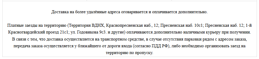 Вы можете изменить адрес на любой другой в пределах зоны доставки до 18:00 накануне дня доставки. Если Вы решили изменить адрес в день доставки, это возможно при условии, что новый адрес будет находиться в зоне доставки конкретного курьера. В ином случае доставка будет осуществляться по дополнительной договоренности и дополнительной оплатой.